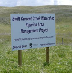 The project was set up on 160 acres of pasture which the Swift Current Creek flows through. About 250 head of cattle graze this area using the creek as a water source. A watering system was set up and fenced off to prevent any damage from cattle. Water quality tests were completed five times during the growing season of 2011, 2012 and 2013: once in June, twice in July and twice in August. Water samples were collected, placed in a cooler with ice packs and shipped directly to Saskatchewan Research Council (SRC) for testing of e coli (Most Probable Number per 100 millilitres [MPN/100mL]) and total coliforms(MPN/100mL). When water was collected to send to SRC an extra bottle was collected, frozen and sent to the University of Regina for DNA testing. DNA was collected to determine if the fecal coliforms were bovine or ungulate. In addition to field data and notes, results pertaining to water level (m) and discharge (m3/s) were obtained from the Government of Canada hydrometric station (Station 05HD036) just upstream from the project site. Finally, a riparian health assessment was completed on the site at the beginning of the project, on September 15th, 2010, and again at the end of 2013, on November 12th, 2013.