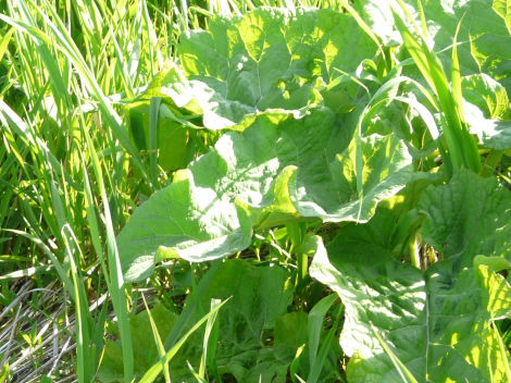 Common Burdock (Arctium minus) grows over the course of two years. The first year it grows large basal rosette leaves such as the ones pictured below.