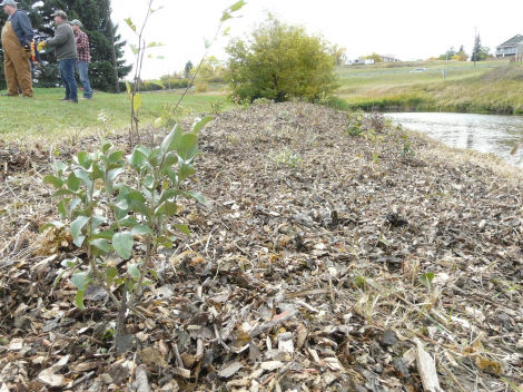 On May 30, 2014 the SCCWS team along with members of the City of Swift Current staff went to the site to plant the trees obtained from the PFRA Shelterbelt. Some of the trees planted were: chokecherry (Prunus virginiana), red osier dogwood (below)(Cornus sericea), willows (below)(Salix sp), snowberry and cinquefoil (Potentilla sp). Over time, these shrubs will grow into a diverse forest of riparian vegetation, which will work to clean and conserve water as it enters the creek, protect the creek banks and provide habitat for birds and wildlife.