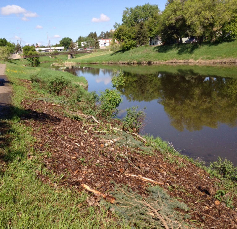 Any vegetation found with field bindweed was also removed. Patches of vegetation were left in random areas to help prevent erosion and to maintain bank stability. To further aid in erosion prevention bioengineering techniques were used. This included constructing barriers made of the cut woody debris made into bundles and weaved into woody stakes inserted into the ground. This method of “basket-weaving” the bundles along the slope will help in holding back sediments washing down from heavy rainfall and winter melt waters.