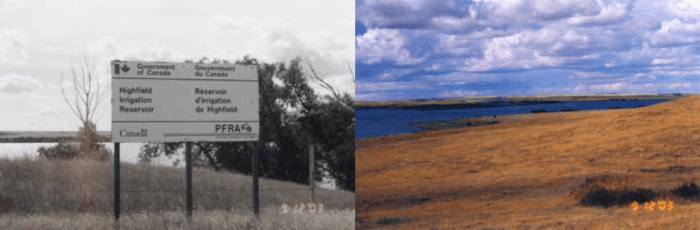 This reservoir was constructed in 1942 and holds 14,934 dam3, the equivalent of almost 6,000 Olympic sized swimming pools in storage capacity and covers an area of 1282 acres. This reservoir serves as a water source for irrigation directly from the reservoir as well as supplying the water for the Rush Lake Irrigation project. Highfield Reservoir is upstream of the Herbert Irrigation Project and indirectly supplies water to that project as well as to the Town of Herbert.
